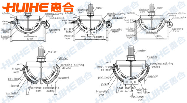 Jacketed kettle with agitator usual use for higher viscosity material, such as porridge, invert sugar etc. Agitate have normal agitate and scraping the bottom and edge, according to the material of the viscous to choose the type which to use.Directory
