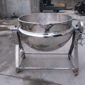 燃氣夾層鍋:就是人工打開氣閥,點燃燃氣,加入食用油,待油溫達到烹飪溫度時,加入適量的物料,人工翻鍋、攪拌,使物料在鍋里均勻受熱。待物料加工完畢后,關氣熄火,轉(zhuǎn)動手柄,通過蝸輪、蝸桿傳動裝置,使鍋體旋轉(zhuǎn)傾斜,將物料倒入另一容器內(nèi)。